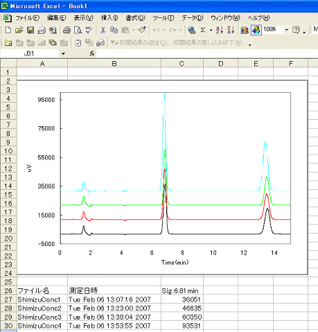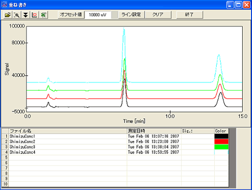 取り込んだクロマトグラムデータを最大10個まで重ねて表示させる事が出来ます。