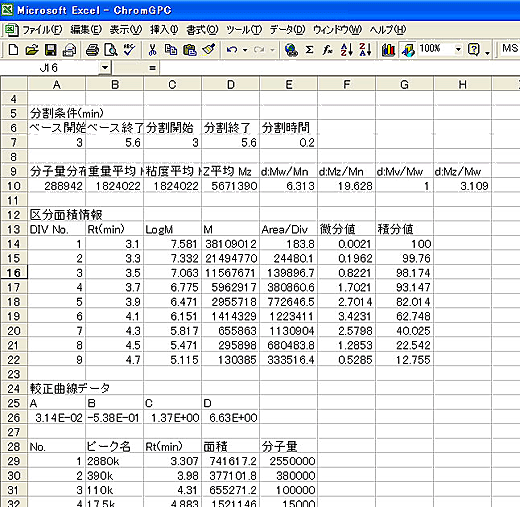優れた操作性で好評なChromato-PROのドッキングウィンドウ機能をそのまま採用しています。クロマトグラムの区分処理結果、較正曲線情報、各分子量計算情報が、分かり易く表示されます。